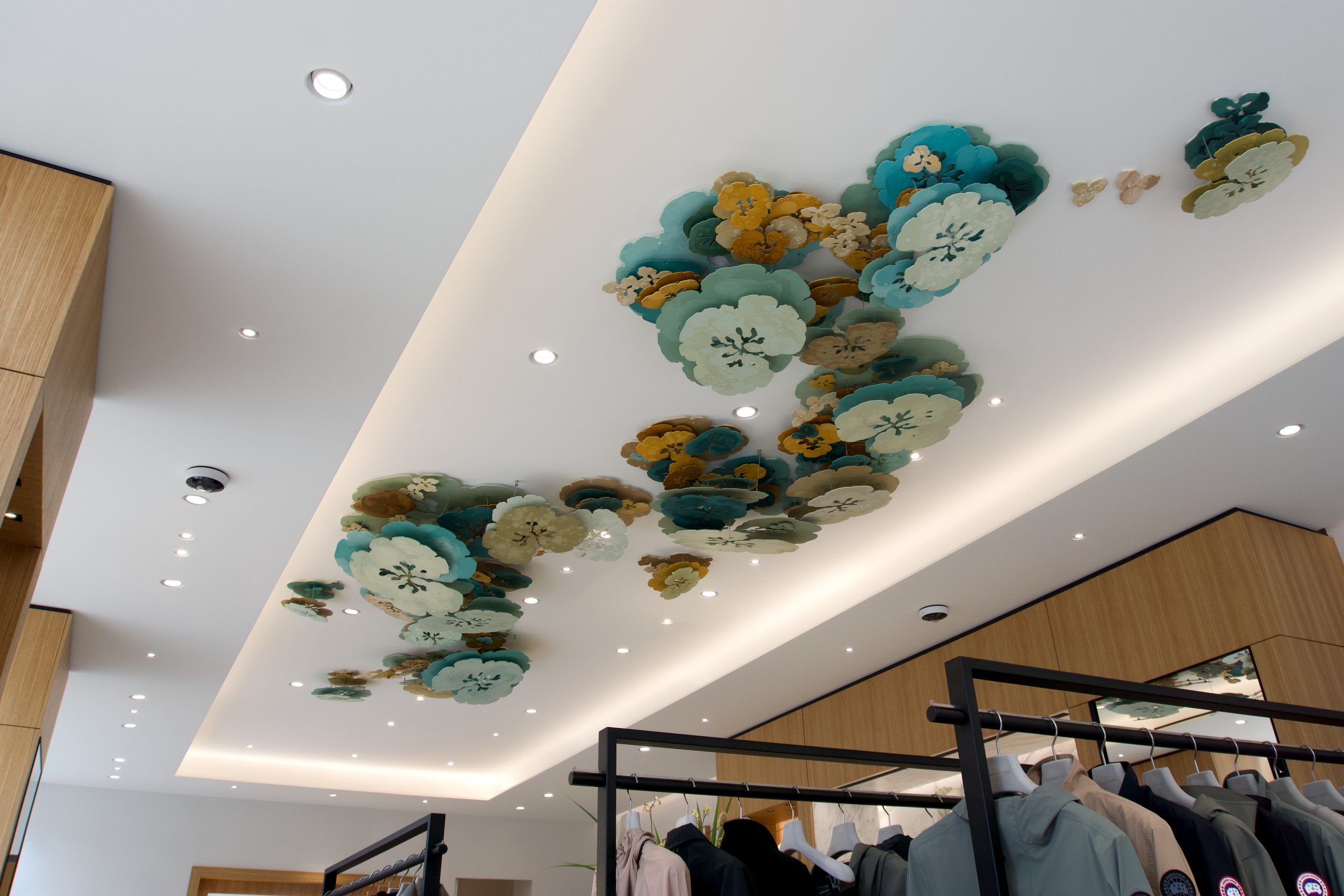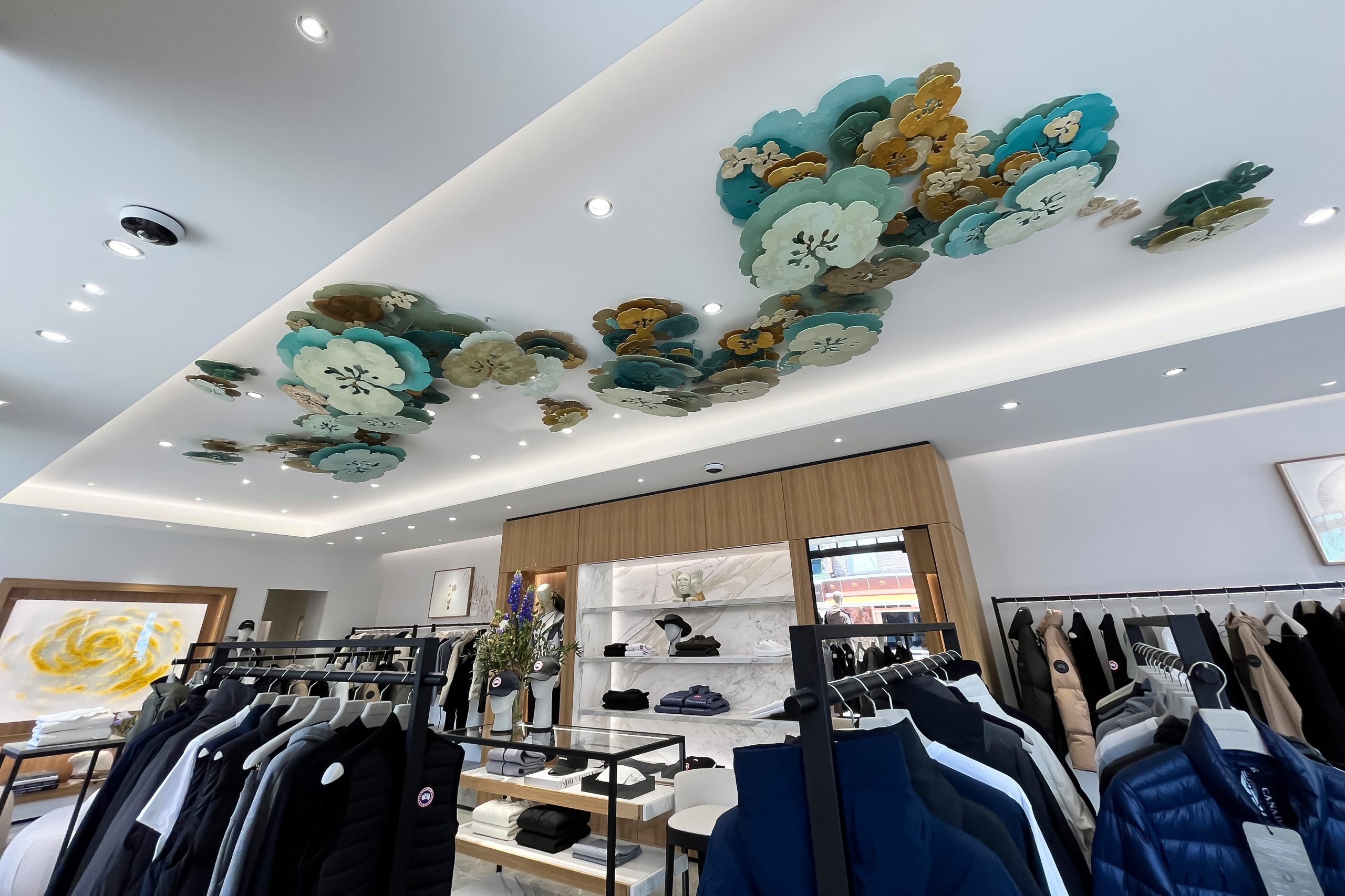 Professionele documentatie van een indrukwekkend monumentaal kunstwerk dat het plafond van de boutique siert