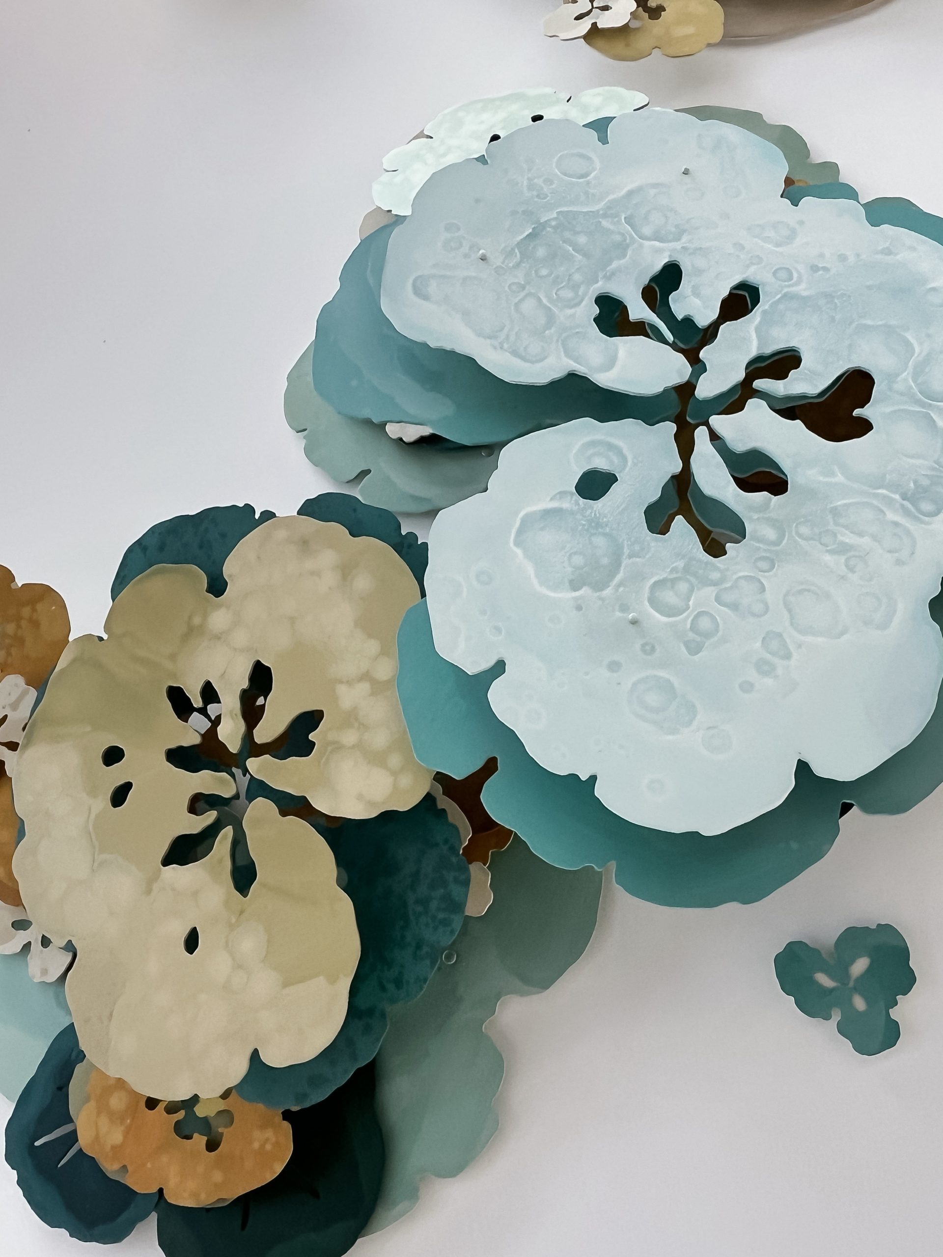 Tonen van de unieke techniek: handgeschilderde texturen opgebouwd uit meerdere lasergeknipte lagen